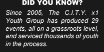 Since its formation in 2005, C.I.T.Y. x1 has produced over 35 social mixers and serviced nearly 7,500 youth. Through our on-going partnerships with local service providers & nonprofit organizations, we have been able to link thousands of young people to a variety of social services like HIV & STD Testing, GED Enrollment, emotional support, substance abuse treatment, and have also successfully gotten several youth off the streets and into transitional living programs.